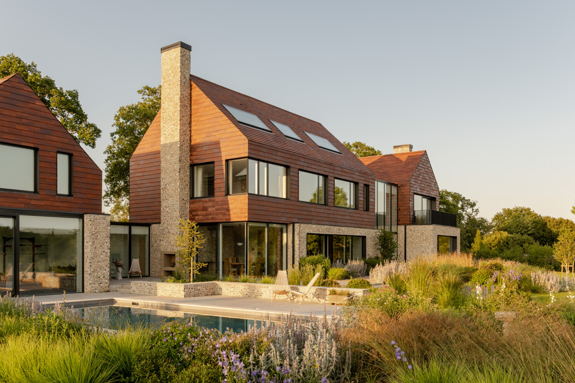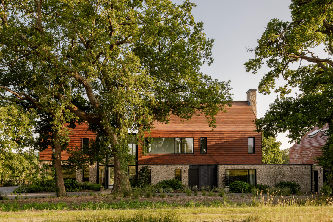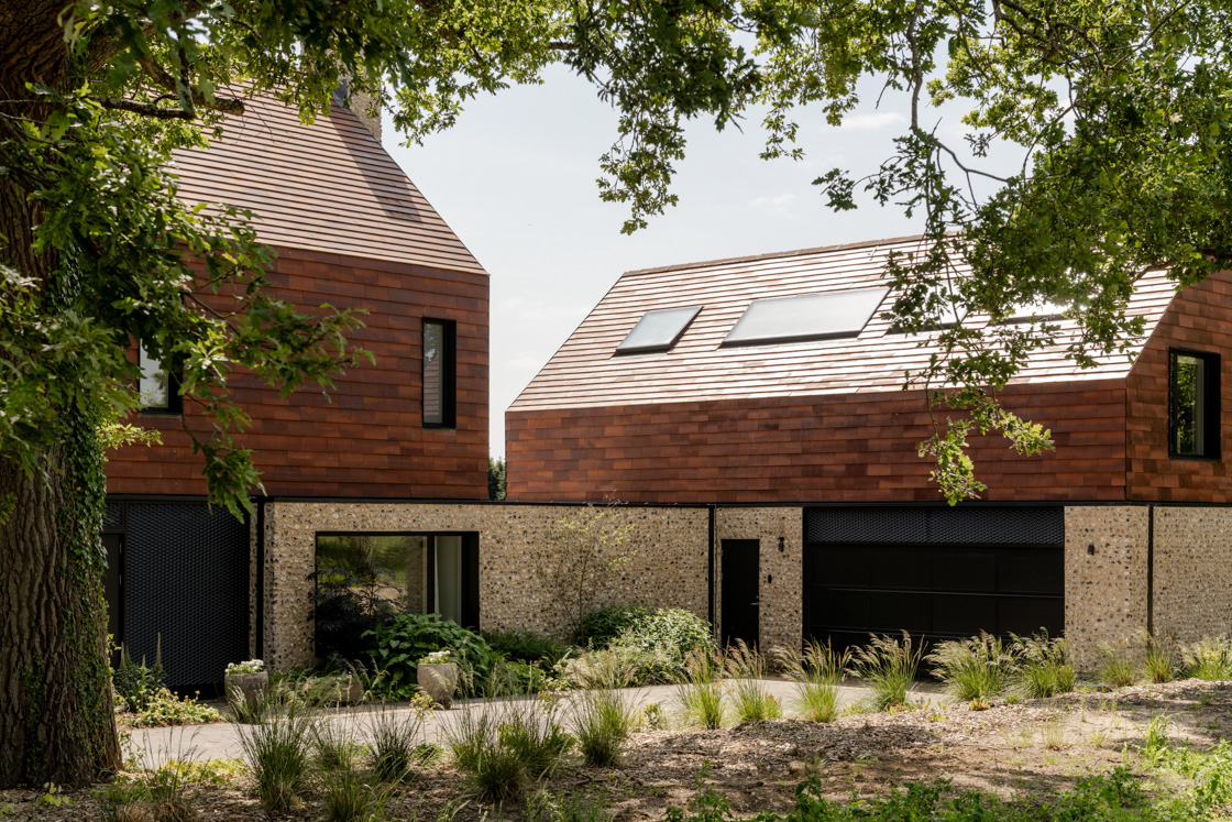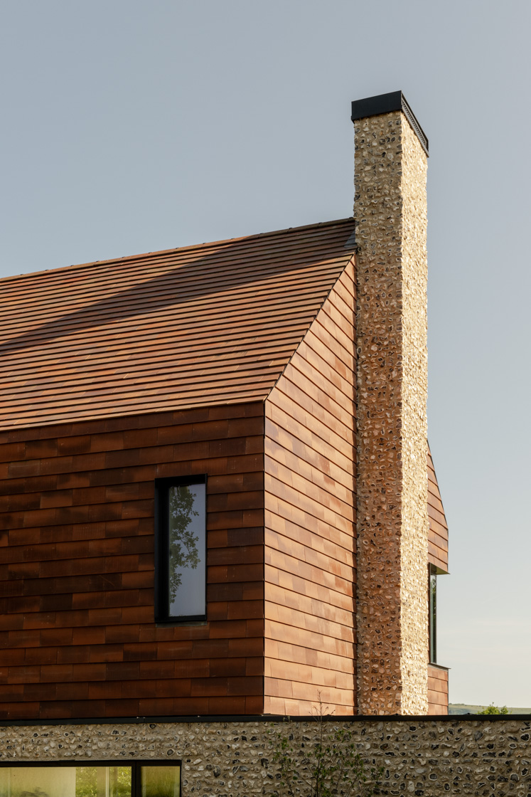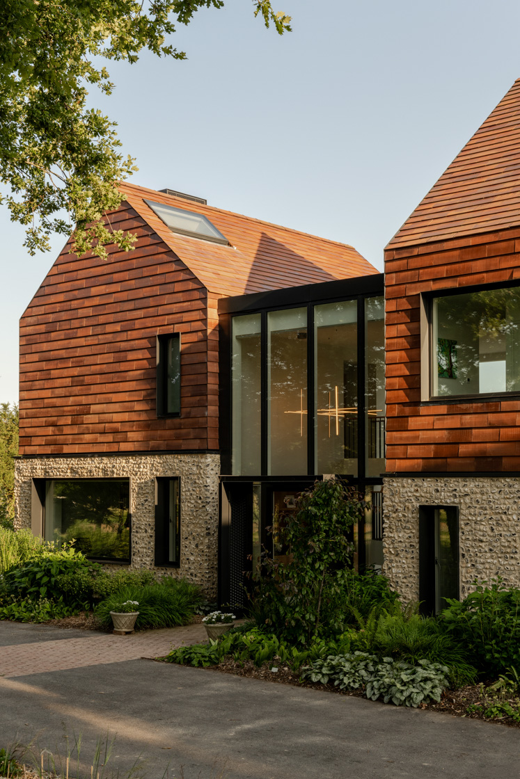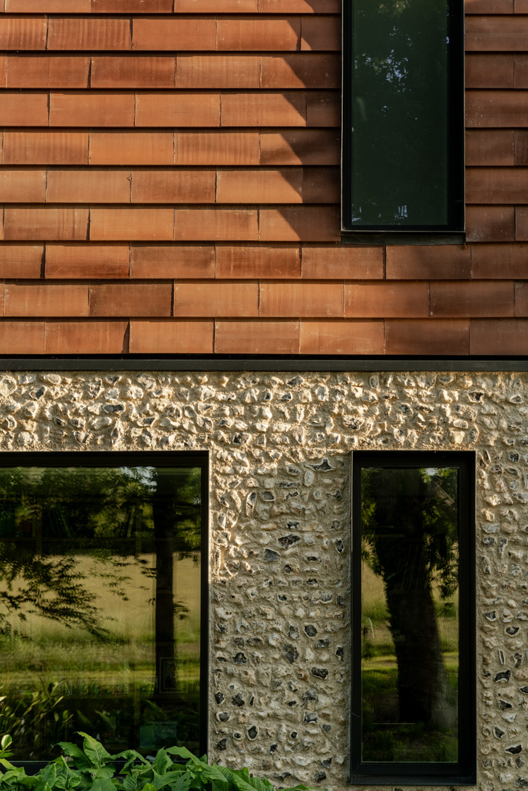 Built with triple-glazed window packs, ground-source heat pumps, MVHR systems, and photovoltaic arrays, the project combines high-performance mechanics with traditional materials. Flint and clay tiles reference regional craftsmanship, while the home’s environmental strategy ensures longevity and a reduced carbon footprint.
