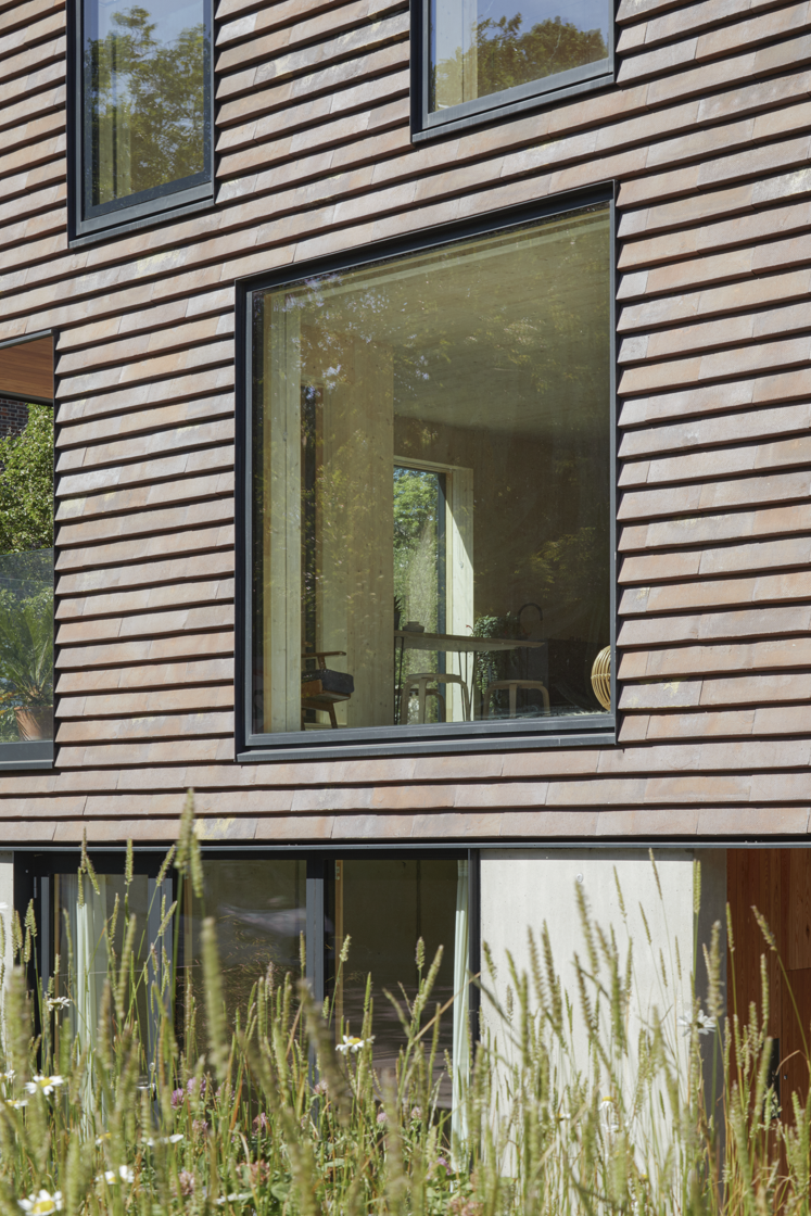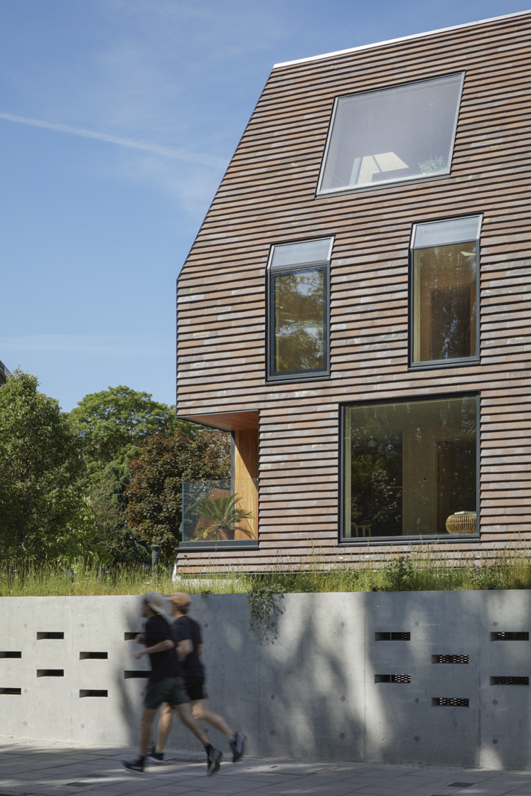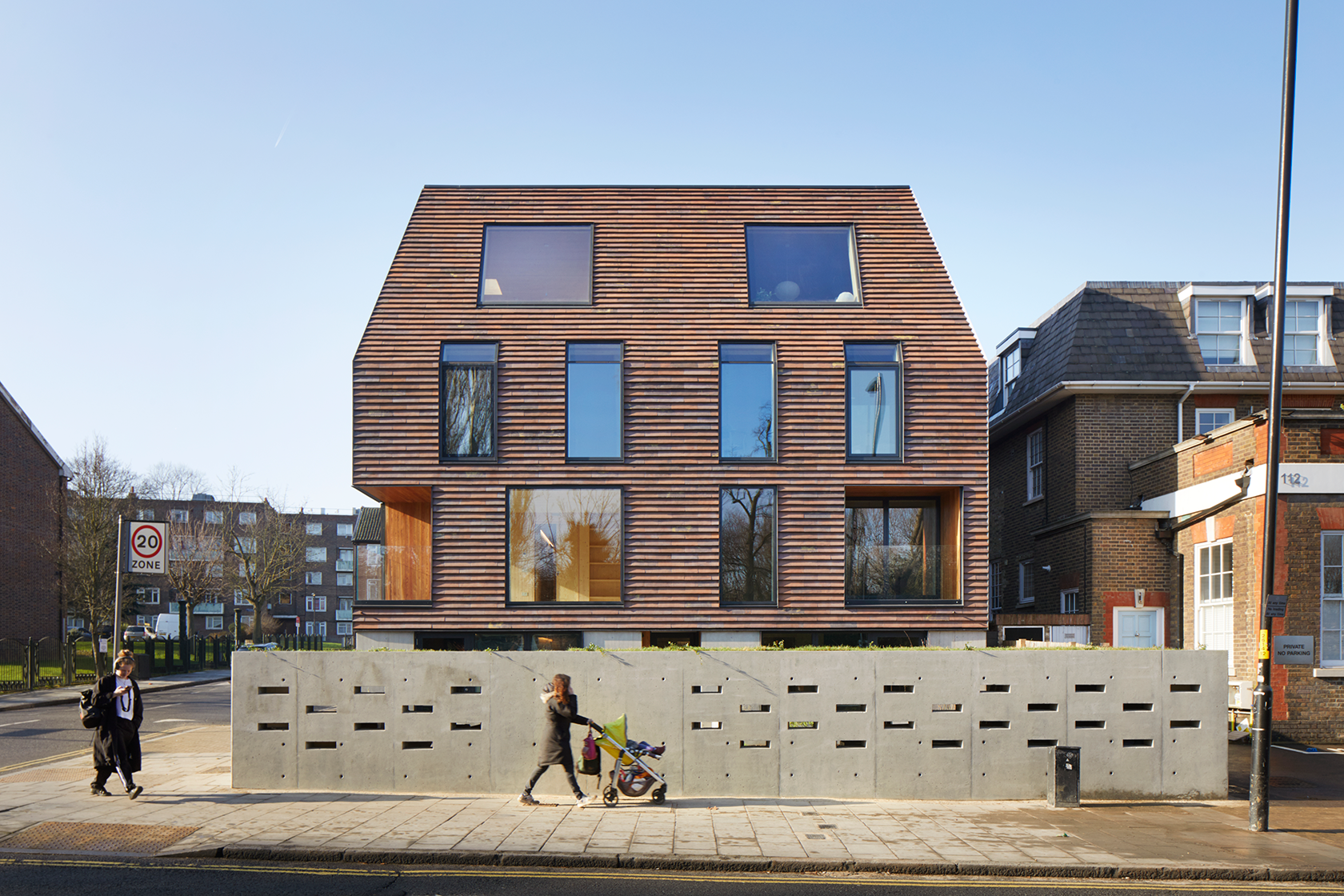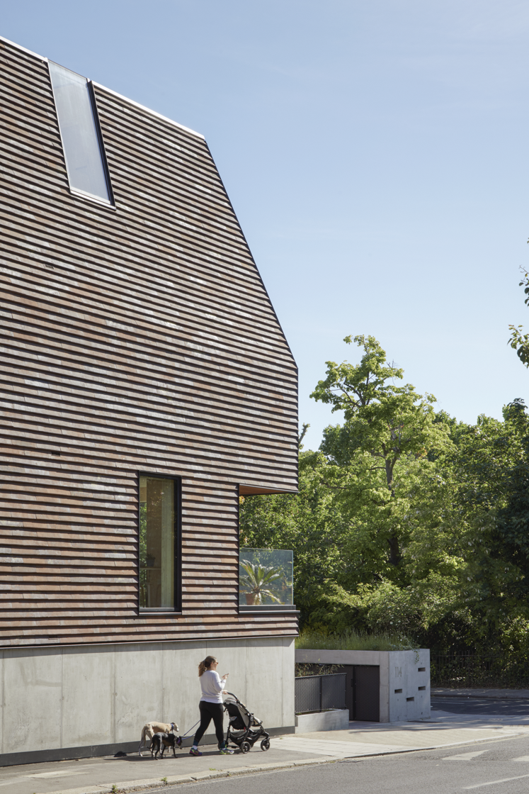 Rye Apartments is a ten-unit sustainable development located ona prominent corner site opposite Peckam Rye Park in London. Designed with a clear focus on contextual sensitivity and performance, the two-block scheme blends seamlessly into its red-brick surroundings while asserting a contemporary, sculptural identity. Clad in the Petersen C48 Cover Tile, the buildings reinterperet familiar materials through a refined, modern architecturak language that responds to site constraints, privacy needs, and environmental priorities.