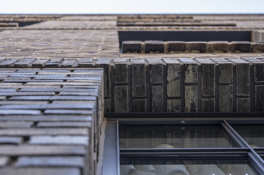 The Architectural character is defined by its crafted façades, which feature a bespoke blend of Petersen D46 and D97 bricks. A defining feature is the corbelled brickwork – a technique where each course is offset to project slightly from the course below. This creates a staggered, textural rhythm across elevations, producing varying depths of shadow that shift throughout the day. The result is tactile, visually engaging skin that references both traditional masonry craft and modern architectural composition. This corbelling technique, also seen in projects like Medina House, helps lend mass and sculptural quality to otherwise flat façades.